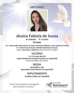 Leia maisA jovem de 23 anos que morreu após acidente em Montenegro terá a sua despedida em Tupandi, onde morou e tem familiares. Conforme anúncio da Funerária Hartmann, o velório de…