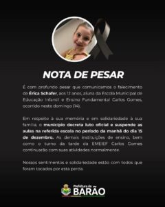 Uma tragédia causa grande comoção no município de Barão. Uma menina de 11 anos morreu após afogamento em uma piscina de uma residência na neste domingo, dia 14. A Prefeitura de Barão emitiu nota de pesar em razão do falecimento de Érica Schafer, aluna da Escola Municipal de Educação Infantil e Ensino Fundamental Carlos Gomes.