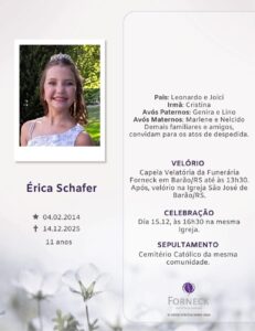 A Capela São José, de Barão, também emitiu nota de pesar, lembrando que Erica celebrou sua Primeira Eucaristia no último domingo, dia 7.