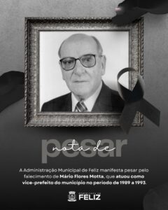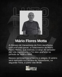 Mário Flores Motta foi vereador por três legislaturas e foi vice-prefeito de 1989 e 1993. Importante liderança que fez parte da construção e desenvolvimento do município, ele tinha 93 anos. Deixa seis filhos, netos, bisnetos, irmãos, demais familiares e muitos amigos. A Prefeitura e a Câmara de Vereadores emitiram notas de pesar.