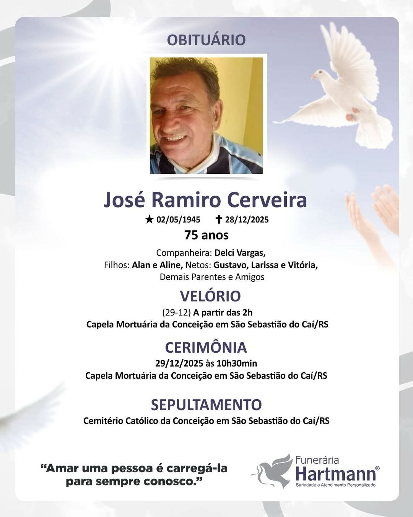 Morador da localidade de Lajeadinho, perto da entrada para o campus da UCS, José Ramiro Cerveira tinha 75 anos. Conhecido como “Zezinho”, era bastante estimado. Familiares e amigos estão bastante consternados com o seu falecimento ocorrido na manhã deste domingo, dia 28, vítima de atropelamento por volta de 9h20, na ERS-122, altura do km 8, no bairro Conceição, em São Sebastião do Caí.