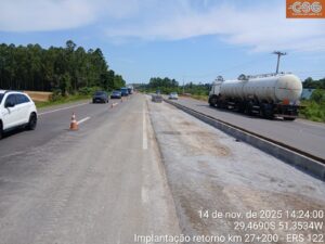 A CSG informa que iniciou as obras para implementação de um retorno no km 27,7 da ERS-122, sentido interior-capital, próximo ao posto da Polícia Rodoviária Estadual (PRE), em Bom Princípio. Os trabalhos iniciaram nesta semana e tem previsão de conclusão até o final do mês de novembro. Durante o período da intervenção, haverá no local estreitamento de pista das 7h às 18 horas.