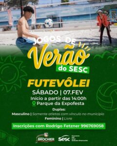 Brochier recebe, nos dias 07 e 08 de fevereiro, a etapa municipal do Circuito Verão Sesc de Esportes, reunindo atletas locais nas modalidades de futevôlei e vôlei de areia. As disputas acontecem no Parque da Expofesta, localizado na Rua Irmãos Brochier, 198, com entrada gratuita e participação exclusiva para quem comprovar vínculo com a cidade.