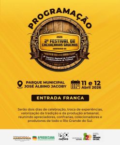 Neste fim de semana o Parque Municipal José Albino Jacoby, de Harmonia, será palco do 2º Festival de Cachaçarias Gaúchas. Durante a programação, no sábado e domingo, dias 11 e 12 de abril, os visitantes terão a oportunidade de saborear as tradições e experiências únicas das melhores cachaças artesanais. E ainda terão muitas outras atrações, incluindo música ao vivo, gastronomia local e degustações especiais. Será uma festa com entrada franca para a família, amigos e apaixonados por cultura e tradição.