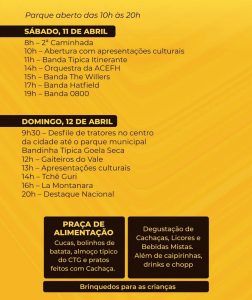 Neste sábado, dia 11, a partir das 8h da manhã tem a 2ª Caminhada. E logo depois o parque estará aberto para visitação a partir das 10h da manhã, com apresentações culturais, banda típica, apresentação da Orquestra ACEFH, bandas The Willers, Hatfield e 0800. Já no domingo, dia 12, a partir das 9h30 terá desfile de tratores, bandinha típica Gaiteiros do Vale, show do grupo Tchê Guri, Bandas La Montanara e Destaque Nacional.